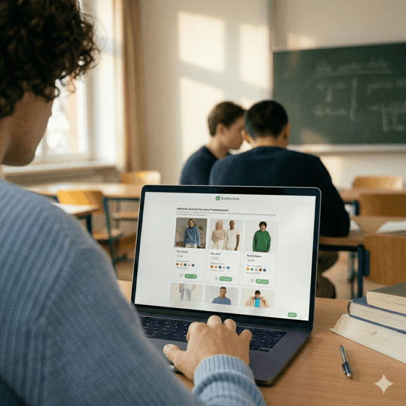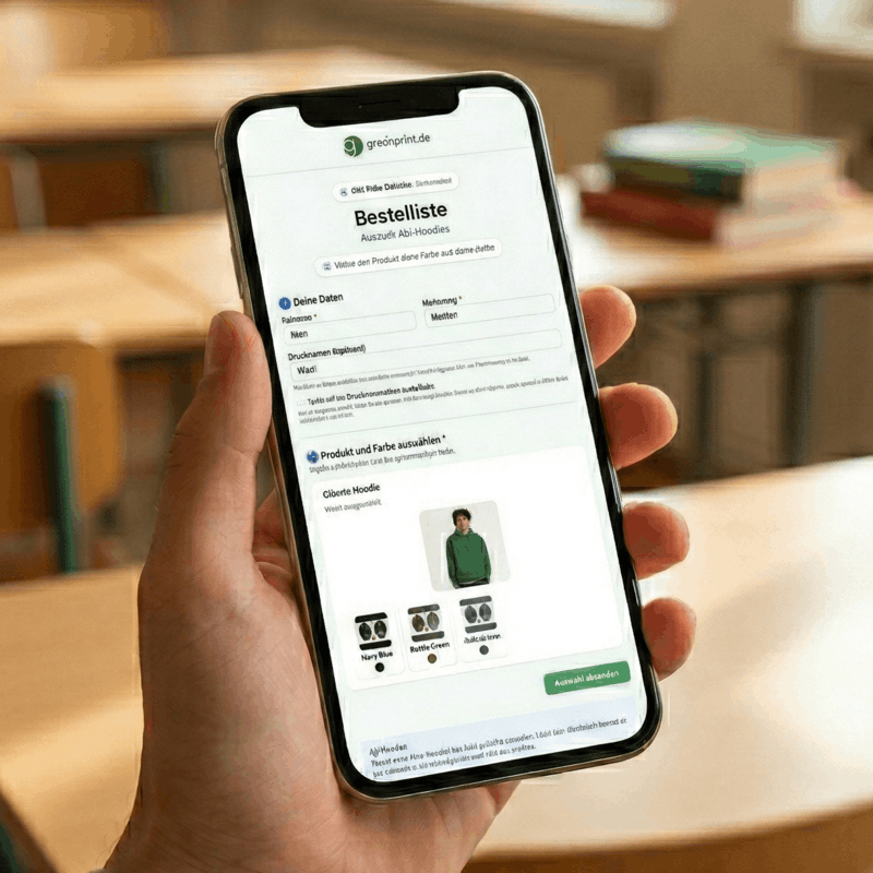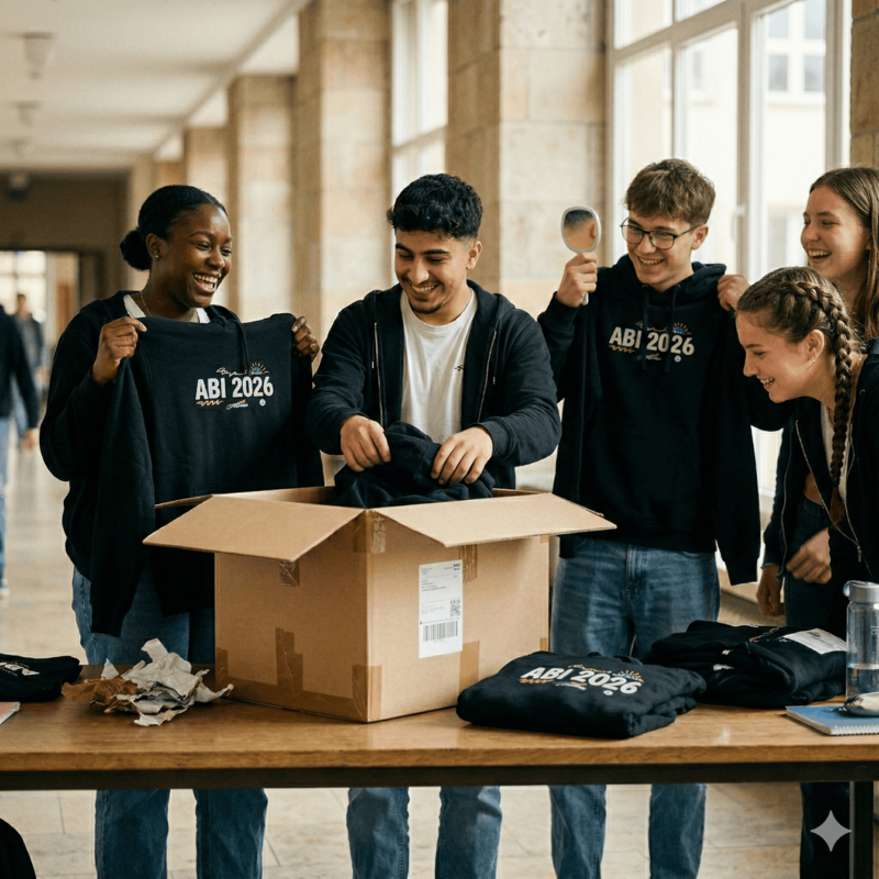 Der Ablauf ist ganz einfach: Ihr wählt auf unserer Plattform eure Wunschprodukte aus und erhaltet direkt einen Preisüberblick. Anschließend gestalten unsere Designer euer Motiv – Änderungen könnt ihr jederzeit auf der Plattform anmerken. Über einen Klassenlink sammelt ihr dann die Größen und Farbwünsche eures Jahrgangs. Vor der Produktion erhaltet ihr eine finale Druckvorschau zur Freigabe.